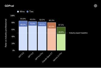 其中最值得关注的指标是GDPval,这个测试不是传统选择题,而是用44种真实职业任务来评估模型,比如分析数据、写报告、做判断。
