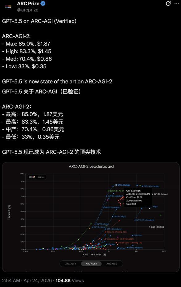 顺便一提,根据ARC Prize官方验证,GPT-5.5在ARC-AGI-2基准测试中取得最高85.0%的准确率,成为了新的SOTA模型。