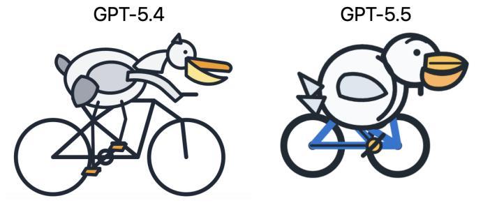 首先是每次都被拉出来的鹈鹕骑自行车,左边是GPT-5.4的表现,右边是GPT-5.5。