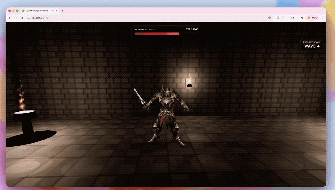 模型不仅搭建了游戏架构,还写出了基于Three.js的前端实现,并覆盖了战斗系统、敌人机制和界面反馈等关键模块;环境贴图和角色对话也由GPT生成。只有角色模型和动画交给了第三方工具处理。