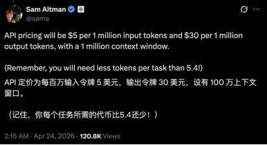 在定价上,GPT-5.5 API为每百万输入token 5美元、输出30美元,Pro版本更高。这个价格是GPT-5.4的两倍。