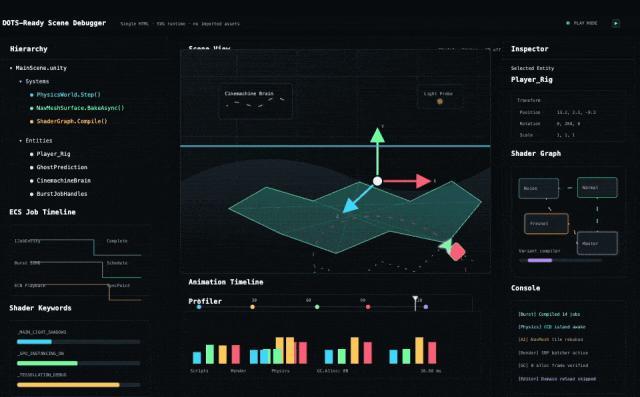 prompt:Create a complex svg animation that an engineer with a background in unity would appreciate.Can run entirely in a single HTML file.